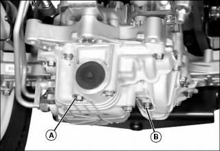 NOTE: Transaxle is divided into two internally connected cavities. Front drain plug (A) will drain hydrostatic side and rear drain plug (B) will drain differential gear side.
