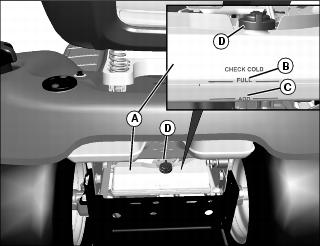 8. Add approximately 2.8 L (3.0 qt) John Deere Low Viscosity HY-GARD (J20D) to transaxle reservoir (D) until oil level is at FULL mark. Install reservoir fill cap.
