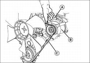 3. Apply force to the alternator housing (B) until tension is correct.