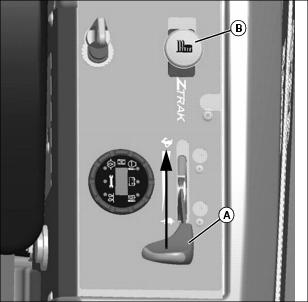 NOTE: Press the PTO shut-off switch in the right motion control lever handle or push the PTO knob (B) down to disengage mower deck.