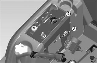 This machine is equipped with an electronic control module located behind the control panel (A). The module controls and monitors all safety interlock functions and the engine glow plug function. The module relays information as codes through an indicator light (B) on the console. (See Using Indicator Lights and Diagnostics in this section.)