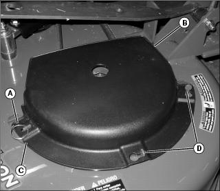 • Lift corner of belt shield from stud (C). Rotate shield counterclockwise to clear head pins (D).