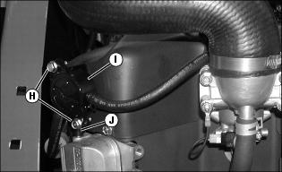 6. Remove the two hex head bolts (H) fuel pump (I) and disconnect the vacuum hose (J).