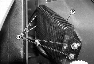 10. Remove the four hex head bolts (O) and remove oil cooler (P).