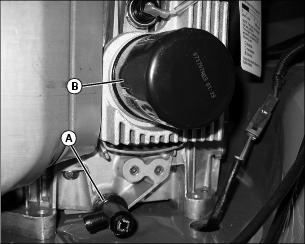 5. After oil drains close the drain plug and remove the oil filter (B). Torque drain plug to 1-1.5 N•m (9-13 lb-in).