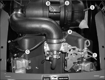 4. Lift bracket (D) and pivot air cleaner assembly (E) out leaving the intake hose connected.