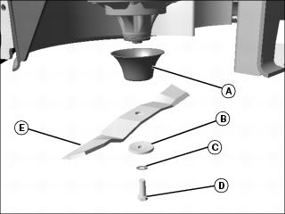 2. Remove screw (D), hardened washer (C), large concave blade washer (B), blade (E) and deflector cup (A).
