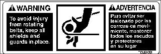 • To avoid injury from rotating belts, keep all shields and guards in place.