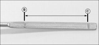 4. Install dipstick, then remove again. Check oil level. Oil should be between levels (B) and (C) on the dipstick.
