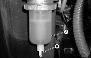 6. If water is present, loosen drain (B) at the bottom of the sediment bowl and drain water.