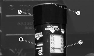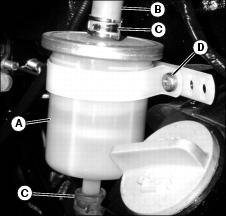 8. Loosen the screw (D) holding the filter mounting strap to the engine block, and remove fuel filter from engine.