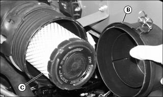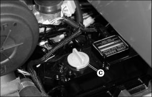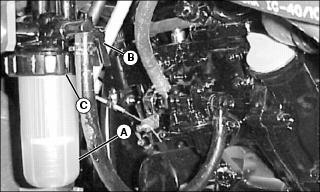 6. Loosen the clamps (C) on fuel hoses above and below fuel filter.
