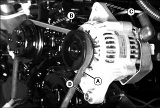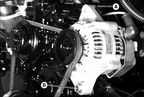 • Apply finger pressure to the belt approximately halfway between the alternator and water pump pulleys at (B). Belt should deflect 10-15 mm (3/8-1/2 in.). Adjust if too tight or too loose.