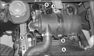 5. Clamp the fuel hose (B) above fuel filter using locking pliers.