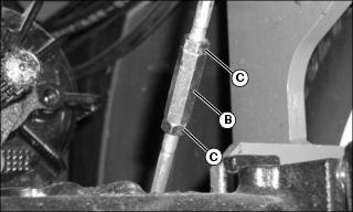 1. Locate the adjustment turnbuckles (B) on the brake rods under the operator’s platform.