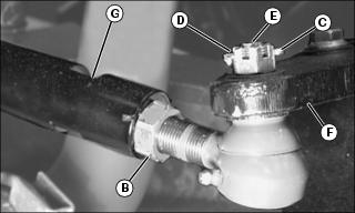 c. Remove tie-rod mounting stud (E) from the steering arm (F).