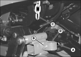 8. Insert bottom link of service latch chain (C) into welded bracket (D) on mower deck lift arm.