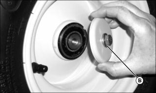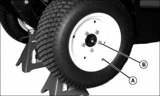 1. Install wheels onto axle hubs with valve stems (A) facing outward. Make sure there is a washer installed on each wheel bolt (B), and install bolts into reinforcement plate, wheel, and hub.