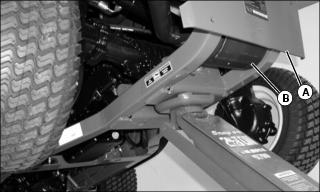 2. Using a floor jack at center of rear frame, lift machine until rear tires are off of ground. Alternatively, the rear frame plate (A) can be used as a jacking or lifting point, but care must be taken not to damage the muffler (B).
