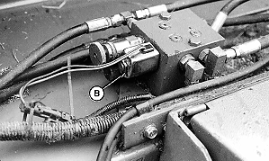 Variable (soft) core feature uses the bale diameter sensor (A) and solenoid valve (B) to lower hydraulic pressure to the tension cylinders. This results in a lower density core at the center of the bale.