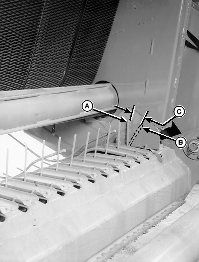 5. Rotate the tooth bar rearward, by hand, until the rotation has stopped. Mark the position of the outside tooth tip (B) on the end stripper panel. Measure and record the distance between marks.