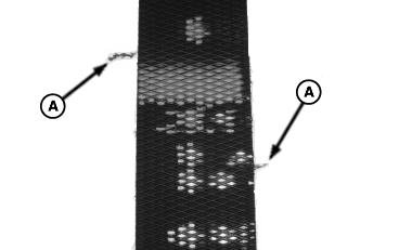 The following illustrations are belts damaged by accumulation of crop and/or foreign objects on top of compressor rack and between belts in the starter roll area. A small slug of the buildup will pass between the lower drive roll and the belt, which forces the belt into the starter roll. The bars of the starter roll remove chunks of rubber from the belt and/or tear the belt fabric.