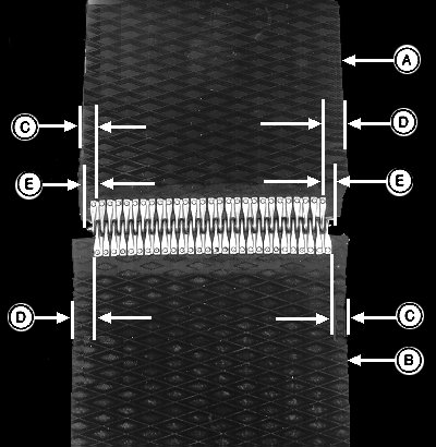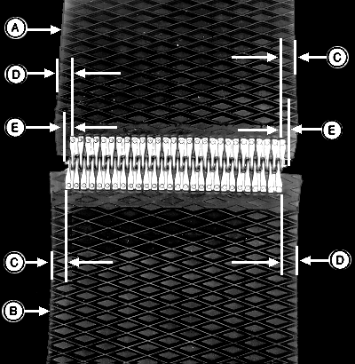 The belt expands when laces are installed. Check alignment of belt edges approximately 51 mm (2 in.) back from end of belt. Belt edges (A and B) should be aligned when belt is joined.