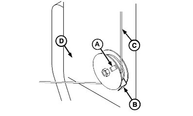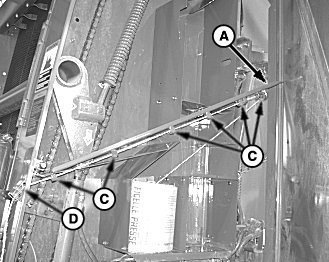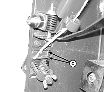 Pull twine through twine tube (B). Pull on twine to remove slack between guides. Twine pull should meet specifications with twine perpendicular to the twine arm. To adjust twine tension (C), refer to ADJUSTING TWINE TENSION in Operating the Baler section.