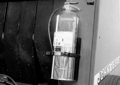 An optional 9.5 L (2-1/2 gal) pressurized-water fire extinguisher can be mounted in the holes that are provided on the baler. (See your John Deere dealer.)