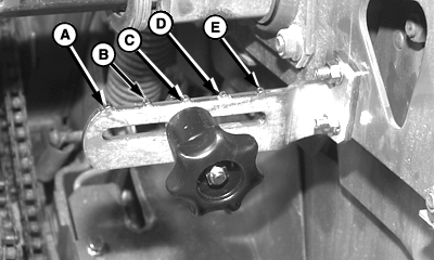 The twine guide controls twine wrap distance from left-hand end of bale. Twine wrap distance can be adjusted from 89-190 mm (3-1/2-7-1/2 in.) at 25 mm (1 in.) increments.