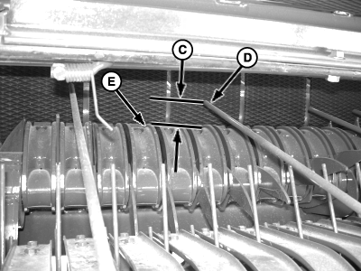 Adjust compressor tube (B) until dimension (C) is 25-30 mm between compressor rods (D) and rotor stripper (E). Tighten round-head bolts (A) and nuts.