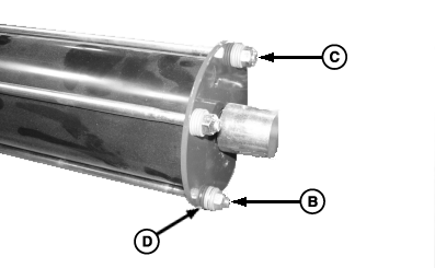 At the heavy point (directly below roller axis), place a mark (D) beside closest nut. Tighten nut (B) 1/4 turn, then spin roller to check balance.