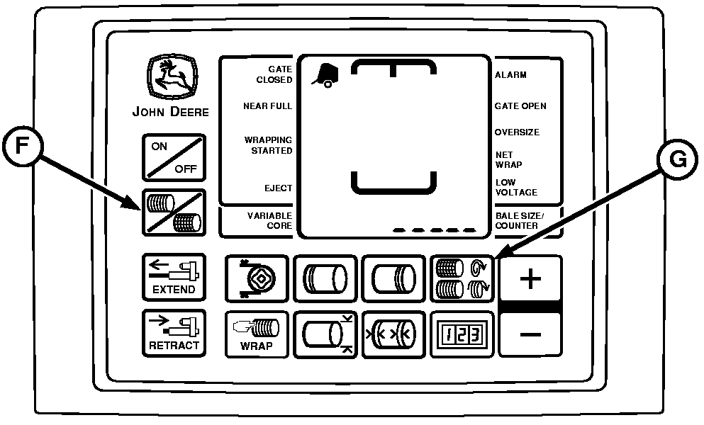 Press TWINE SPACING key (G). Press Plus or MINUS keys until desired twine spacing, 2-26 cm (1.0-10.0 in.) appears in digital display.