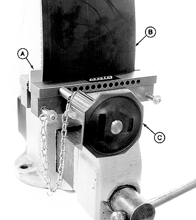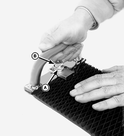 Adjust skiving tool pressure plate to thickness of belt using thumb screw (A).