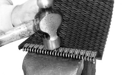 Put belt and lacing on a solid base. Flatten heads of rivets using the flat face of a small hammer. Strike several rivets at a time using a light tapping motion. Rivets should be flush with splice.