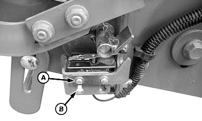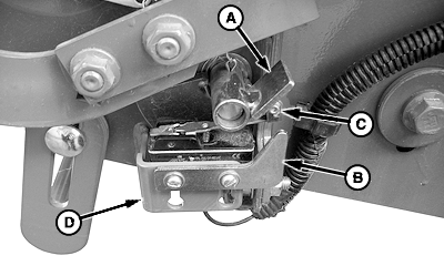 Verify actuator tab (C) overlaps down stop plate (B). Bend plate (B) or bracket (D) to obtain overlap.