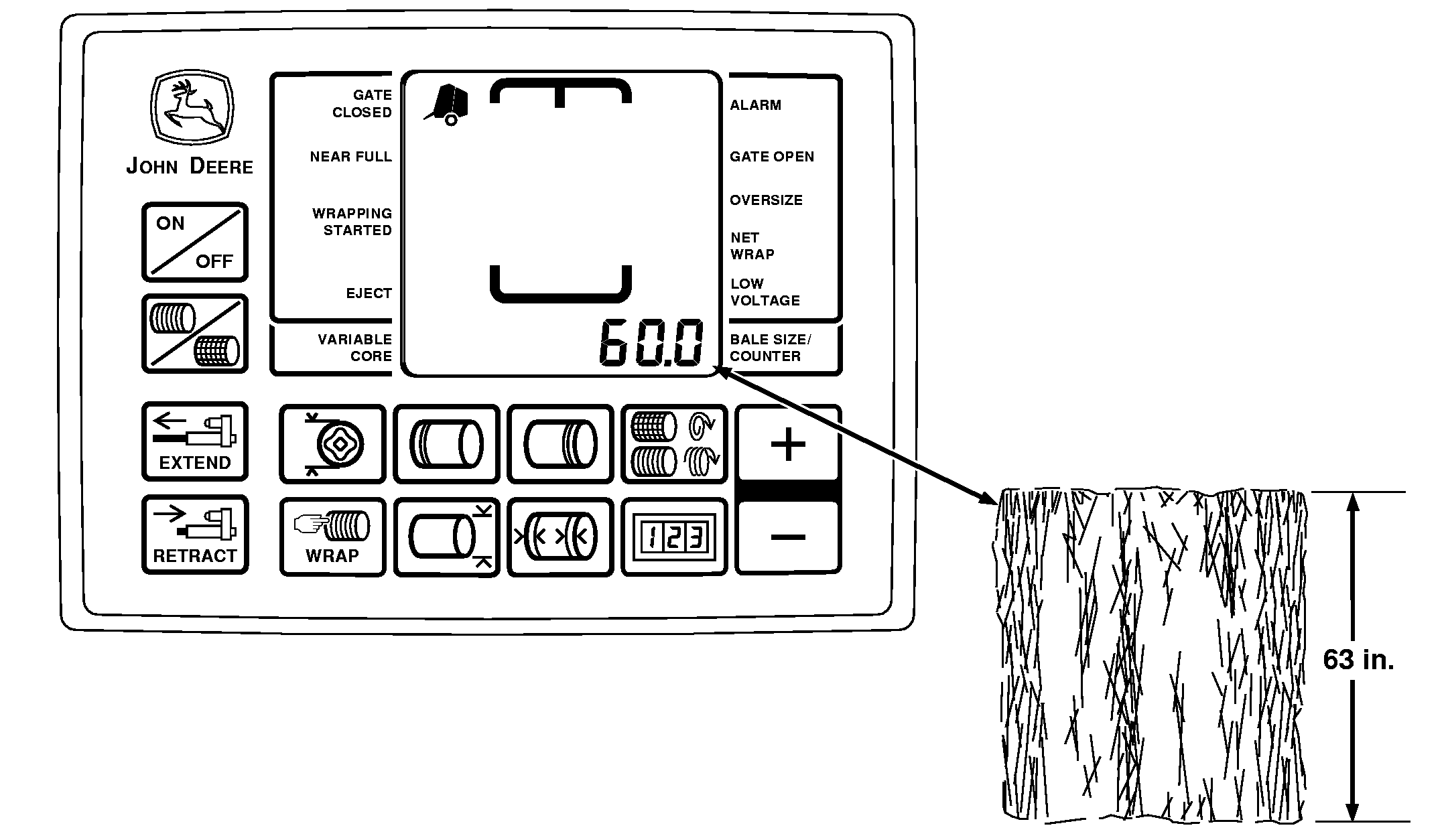 Before ejecting the bale, note the monitor-controller display for bale size/diameter setting.
