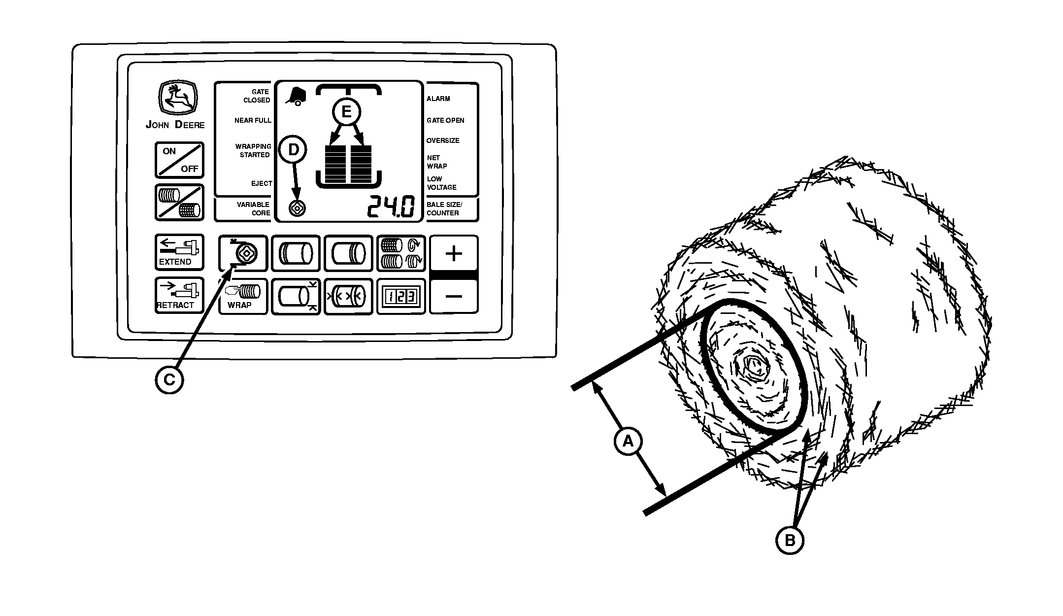 The variable core diameter (A) can be adjusted from 61 cm (24 in.) up to 4 in. below bale diameter setting in 1 cm (0.5 in.) increments.