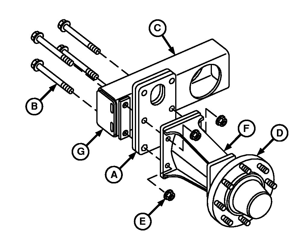 Install spacer plate (A) and wheel spindle with hub (D) on frame (C) with four M16 x 180 cap screws (B) and four M16 nuts (E).