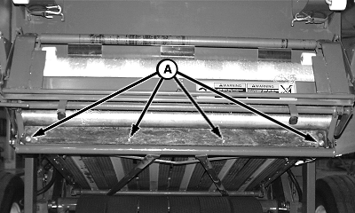 11. Install round-head bolts, washers, and nuts (A) so the round heads facing front of machine. Tighten to specification.