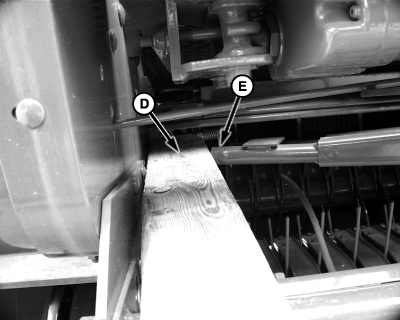 7. Place an 89 mm (3-1/2 in.) wood block (D) on right side of bale chamber, so twine arm (E) will contact the wood block when actuator is extended.
