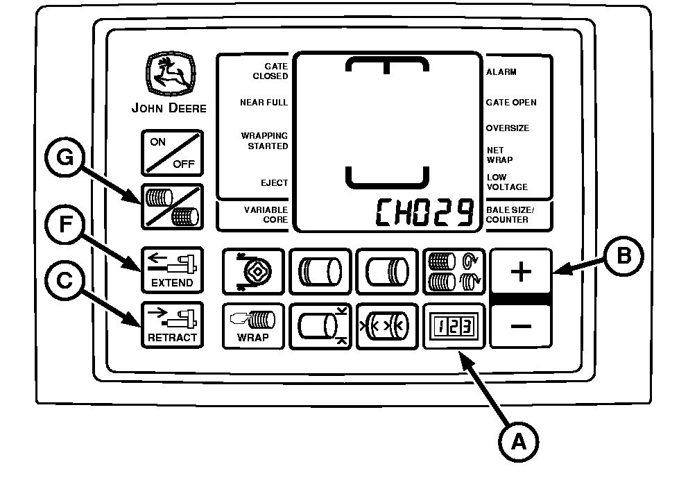 6. Press and hold RETRACT key (C) until twine actuator fully retracts and display reads zero.