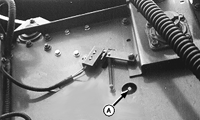 Using tractor selector valve, raise belt tension arm until calibration hole (A) in tension arm is centered in baler access hole.