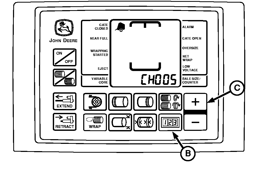 appears in digital display. Release COUNTER key (B) and view bale size sensor number.