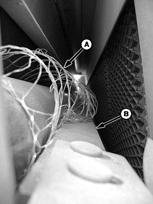 • If net material (A) is looped over counterknife angle (B), brake torque may be too low. (See CHECKING AND ADJUSTING NET WRAP FEED ROLL BRAKE in this section.