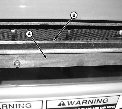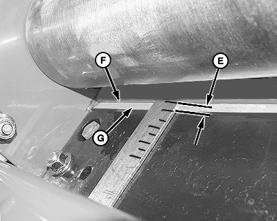 Mark bolt heads relative to slots as reference. Raise counterknife angle to access bolts (A). Measure distance (E) from counterknife angle edge (F) to rear edge of knife bevel (G). Distance (E) should be 6-16 mm (0.23-0.63 in.) Distance must be the same on both ends of knife.