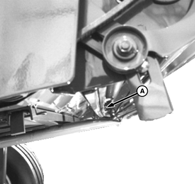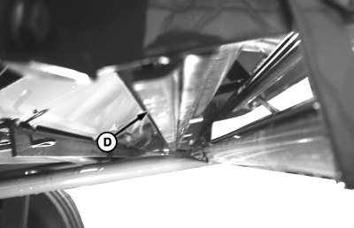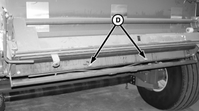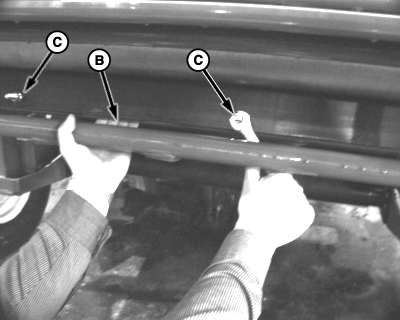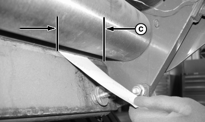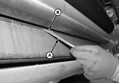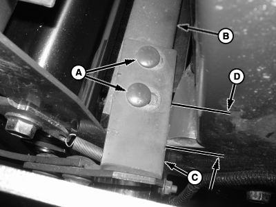 With paper, check if right-hand side of counterknife angle (B) or counterknife arm support (C) contacts baler frame. If contact occurs, raise counterknife angle and grind contact area of frame (D) 1-2 mm (0.04-0.8 in.) deep.