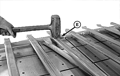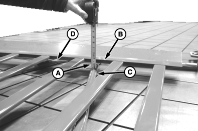 • If distance (A) is more than 57 mm (2.2 in.), use a dead blow hammer and tap on each net pan channel (E) near front crossbar. Recheck distance (A) and repeat as needed.