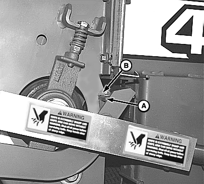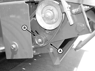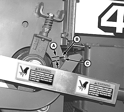 If clearance is not within specifications, adjust idler (A) in idler arm slot until clearance is within specified range.