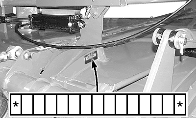 The rotary cutter serial number label is located on the back left-hand side of frame, near the wing lift cylinder.